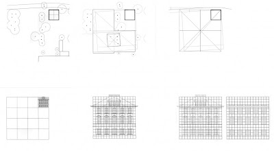 Cortes transversales, muestran la integración del nuevo volumen siguiendo la misma proporción y altura de la villa existente.Luego, hizo tres copias de este cubo disponiéndolas simétricamente en el terreno y generando una grilla virtual ordenadora. Posteriormente, sobrepuso una grilla girada 3.5 °, cuya rotación obedece a la orientación del río, y que alberga principalmente las circulaciones, tanto exteriores como interiores. Todos los elementos de la composición encajan dentro de estas dos tramas superpuestas.
