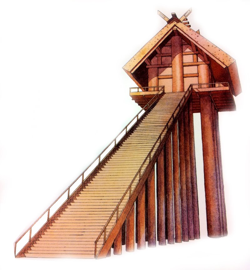 Reconstrucción del Santuario Izumo Taisha, Shimane en la antigüedad. Imagen cortesía de Tan Hong Yew. Es más, la doctrina del “honji suijaku”, que sugiere que los dioses japoneses son manifestaciones temporales de los budas en este mundo, igualó los dioses Shinto con las deidades budistas y ayudó a contener la oposición hacia la repentina popularidad del budismo. Por tanto, los santuarios sintoístas empezaron a tomar más características del budismo. Los santuarios incluyeron elementos como corredores conectando edificios, puertas de dos niveles y pagodas, así como adquirieron mayor tamaño. Sin embargo, hay todavía figuras únicas para el sintoísmo. Por ejemplo, los torii, o arcos que marcan la entrada a un lugar sagrado, o los caminos sando, que llevan en línea directa a los santuarios, los pares de komainu, los perros-leones que se apuestan como guardianes al ingreso del santuario, los grandes troncos llamados que se proyectan en forma de V, y los chigi, protuberancias en forma de cuerno ubicadas en el borde de los techos.