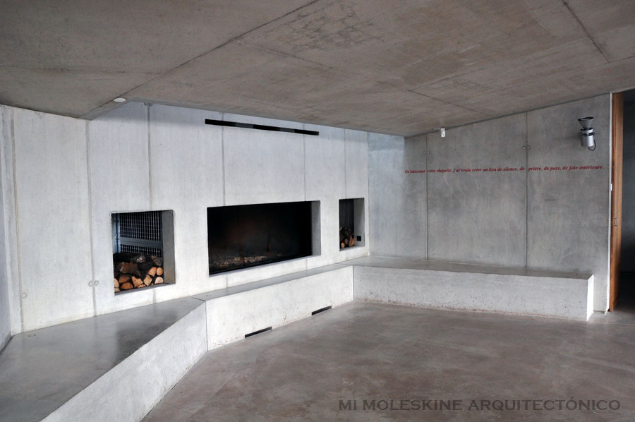 Contiene una boletería, una tienda, un área de reuniones, áreas administrativas y de investigación y y una pequeña zona de exhibición, de la cual he sacado algunas de las fotos que ilustran estos tres posts sobre la capilla de Ronchamp. Hay también una chimenea vaciada en concreto, un detalle inusual en una tienda, pero que personalmente agradecí en aquella fría mañana de la visita.