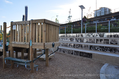 De allí que el parque utiliza elementos reminiscentes del pasado. Por ejemplo, en la llamada Plaza Lytton dentro del parque, una pérgola estilizada evoca la forma del edificio original del mercado de la ciudad, construido en 1893 no lejos de este lugar.